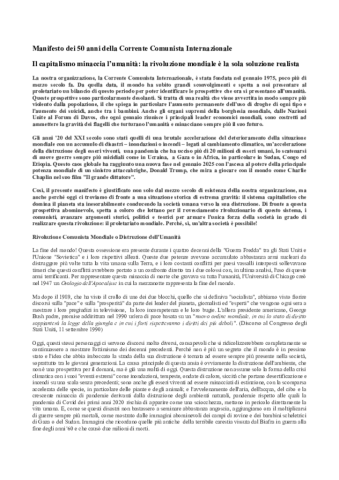 Così, il presente manifesto è giustificato non solo dal mezzo secolo di esistenza della nostra organizzazione, ma anche perché oggi ci troviamo di fronte a una situazione storica di estrema gravità: il sistema capitalistico che domina il pianeta sta inesorabilmente conducendo la società umana verso la sua distruzione. Di fronte a questa prospettiva abominevole, spetta a coloro che lottano per il rovesciamento rivoluzionario di questo sistema, i comunisti, avanzare argomenti storici, politici e teorici per armare l'unica forza della società in grado di realizzare questa rivoluzione: il proletariato mondiale. Perché, sì, un'altra società è possibile!